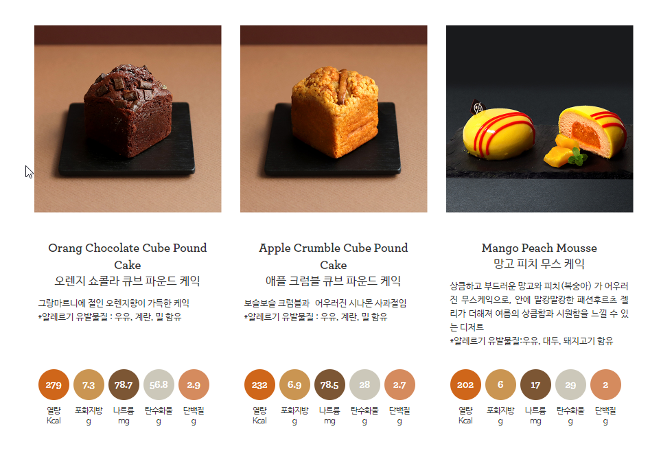 커피빈 메뉴 중에서 오렌지 쇼콜라 큐브 파운드 케익, 애플 크럼블 큐브 파운드 케익, 망고 피치 무스 케익 등 다양한 종류의 케이크도 있어요.