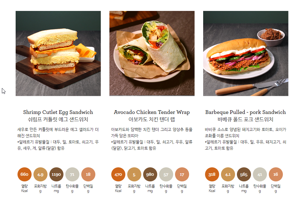 쉬림프 커틀릿 에그 샌드위치, 아보카도 치킨 텐더 랩, 바베큐 폴드 포크 샌드위치 등의 샌드위치도 있는데요. 아침, 점심, 저녁 식사로 딱이네요.
