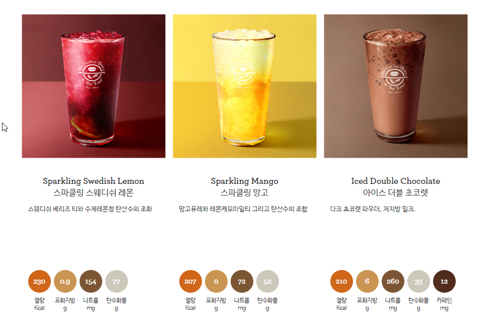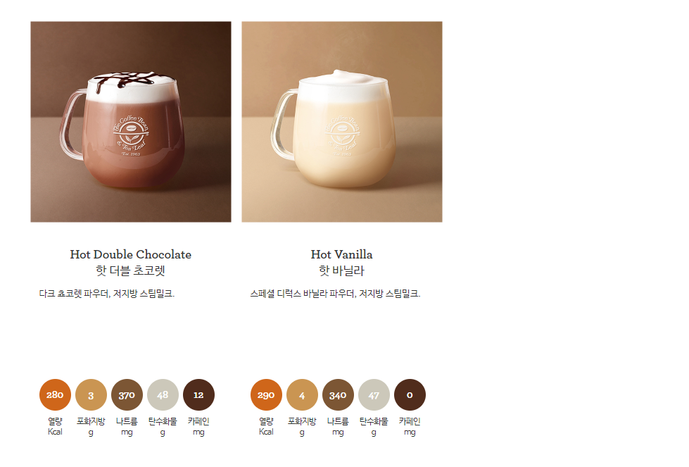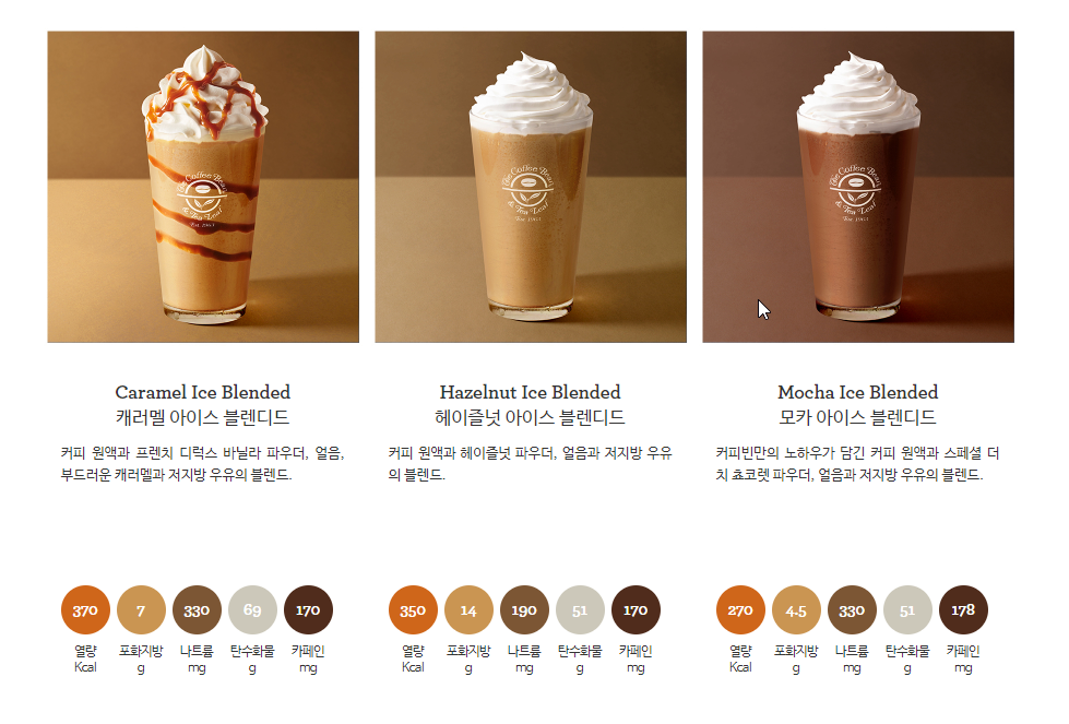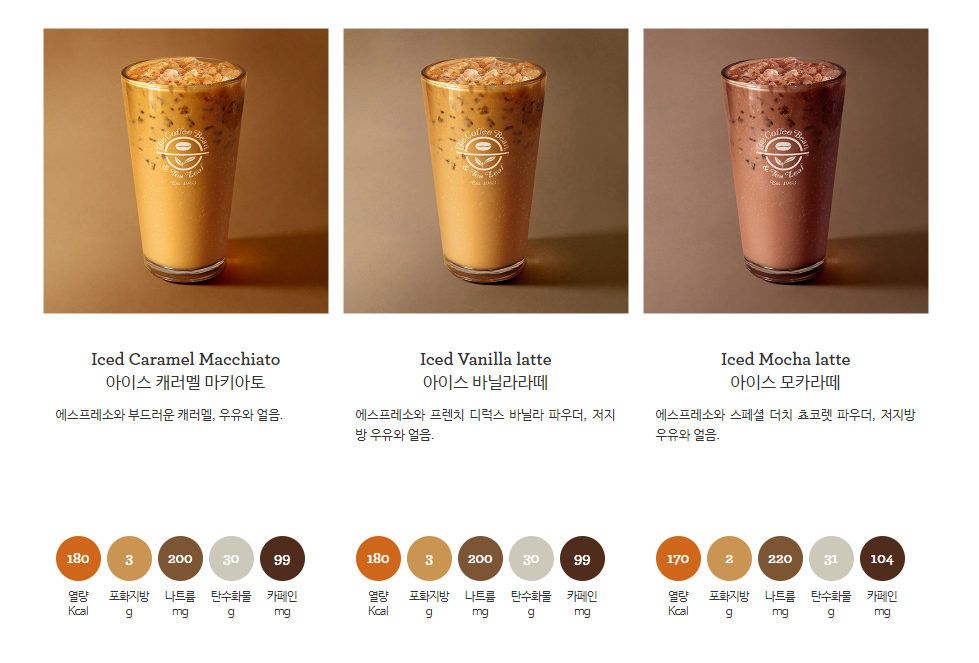 다양한 커피와 음료가 있는 카페 프랜차이즈 브랜드인데요. 에스프레소 베이스의 커피 소개해드릴게요. 아이스 캐러멜 마키아토, 아이스 바닐라라떼, 모카라떼가 있는데요.