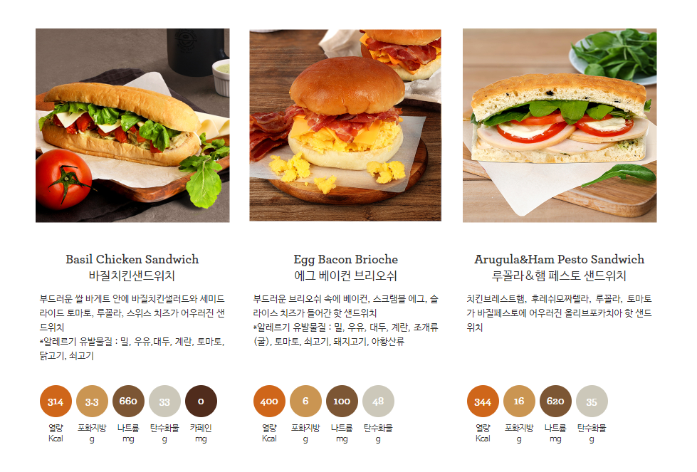 바질치킨 샌드위치도 맛있어 보이는데요. 에그 베이컨 브리오쉬, 루꼴라&햄 페스토 샌드위치도 있어요.