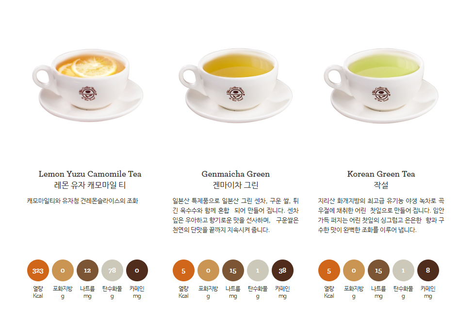 커피빈 메뉴 중 차 종류로는 레몬 유자 캐모마일 티, 겐마이차 그린티, 작설(코리안 그린티) 등이 있는데요. 다양한 종류의 차들이 많아요!!