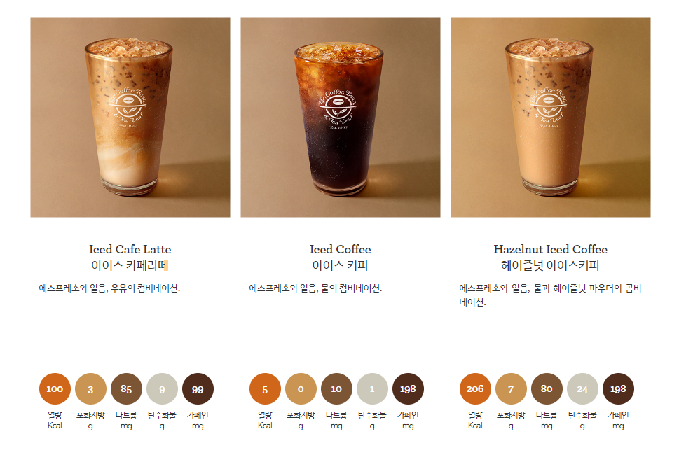 깔끔한 느낌의 아이스 카페라떼, 아이스 커피, 헤이즐넛 아이스커피도 있어요!! 열량, 포화지방, 나트륨, 탄수화물, 카페인 함량 정보 참고하세요!!