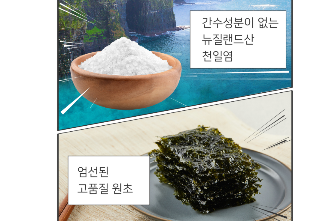 김준호랑이김은 간수성분이 없는 뉴질랜드산 천일염을 사용했다고 하고요. 엄선된 고품질 원초를 사용하여 만들었다고 합니다.