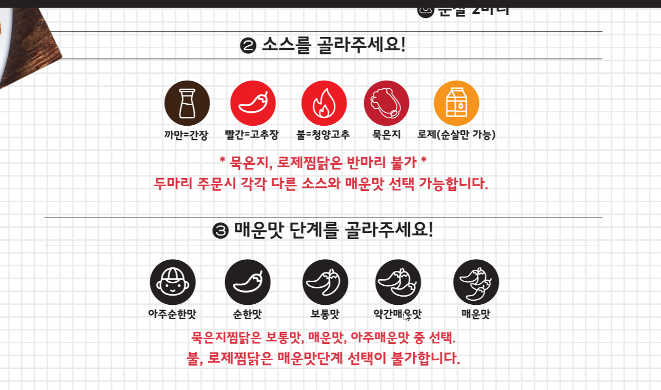소스는 까만(간장), 빨간(고추장), 불(청양고추), 묵은지, 로제(순살만 가능)이 있어요. 매운맛은 아주순한맛, 순한맛, 보통맛, 약간매운맛, 매운맛이 있습니다. 두마리 주문시에는 각각 다른 소스와 매운맛으로 선택할 수 있어요.