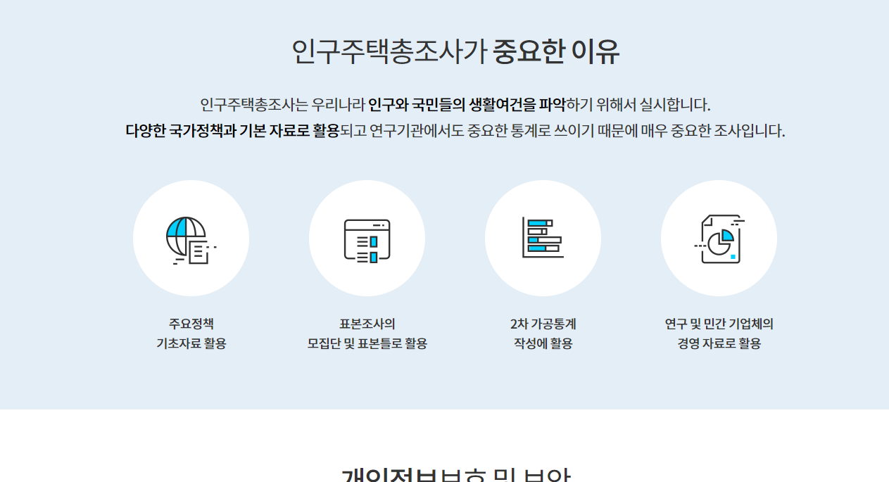 인구주택총조사는 주요정책 기초자료 활용, 표뵨조사의 모집단 및 표본들로 활용되는데요. 2차 가공통계 작성에 활용되기도 하며 연구단체 혹은 민간 기업체의 경영 자료로도 활용됩니다.