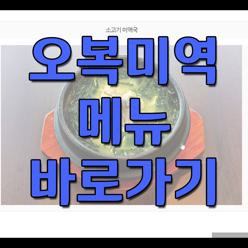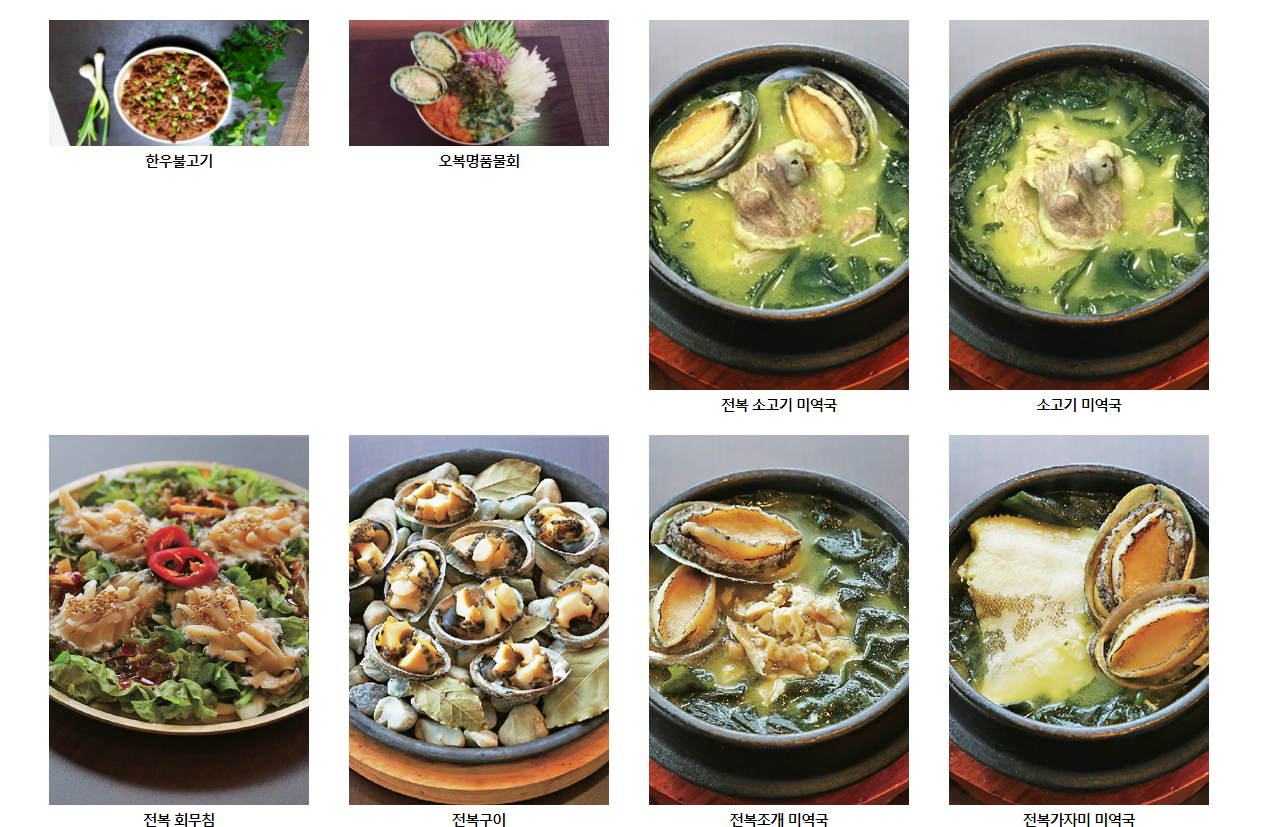 오복미역 메뉴 소개해드리겠습니다. 한우불고기, 오복명품물회, 전복 소고기 미역국, 소고기 미역국, 전복 회무침, 전복구이 등이 있어요.