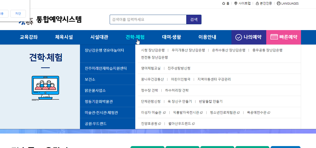 통합예약시스템 사이트에서는 장난감은행, 영어체험교실, 진주성탐방, 꿈나무건강동산, 어린이인형극, 지역아동센터 구강관리, 청동기문화박물관, 맑은물사업소 정수장 견학 및 하수처리장 견학, 이성자 미술관, 청소년진로체험관, 익룡발자국전시관, 진양호공원 등의 견학 및 체험을 신청할 수 있어요.