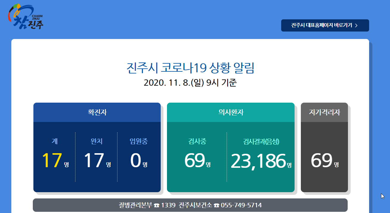 현재는 코로나19 관련하여 상황 알림을 볼 수 있네요. 확진자 수,의사환자 수, 자가격리자 수 나와있고요. 진주시보건소 전화번호는 055-749-5714입니다.