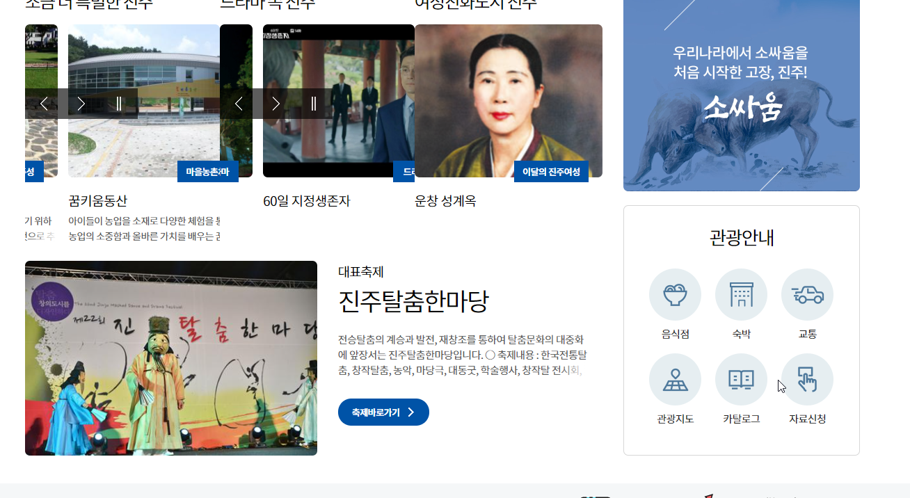 진주시청 홈페이지에서는 꿈키움동산, 음식점 관광 안내, 진주탈춤한마당에 대해서도 살펴볼 수 있습니다.