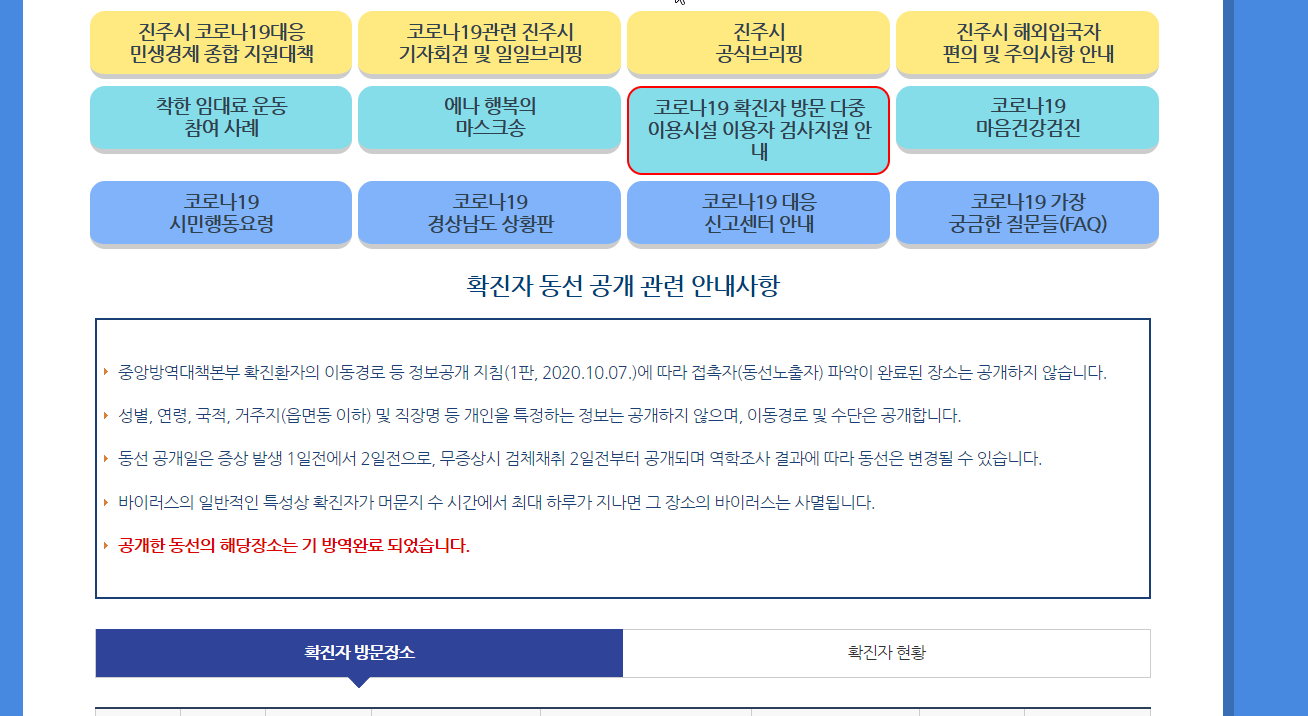 진주시청 홈페이지 코로나 상황 알림페이지를 통해서 진주시 코로나19 대응 민생경제 종합 지원대책, 코로나19 관련 진주시 기자회견 및 일일브리핑, 마음건강검진, 에나 행복의 마스크송, 착한 임대료 운동 참여 사례, 신고센터 아내, 경상남도 상황판 등을 볼 수 있어요.
