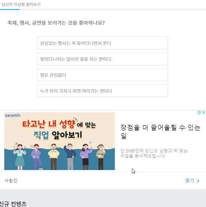 이상형 테스트는 몇가지 질문에 대한 답변을 하면 되는데요. 축제, 행사, 공연을 보러가는 것을 좋아하나요?와 같은 질문에 대답하면 돼요.