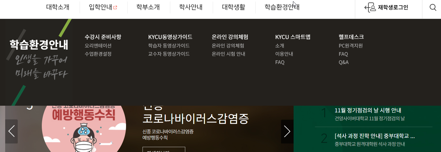 학습환경 안내에서는 수강 오리엔테이션, 수업환경설정, 학습자 동영상가이드, 온라인 강의체험, KYCU 스마트앱 살펴볼 수 있어요.