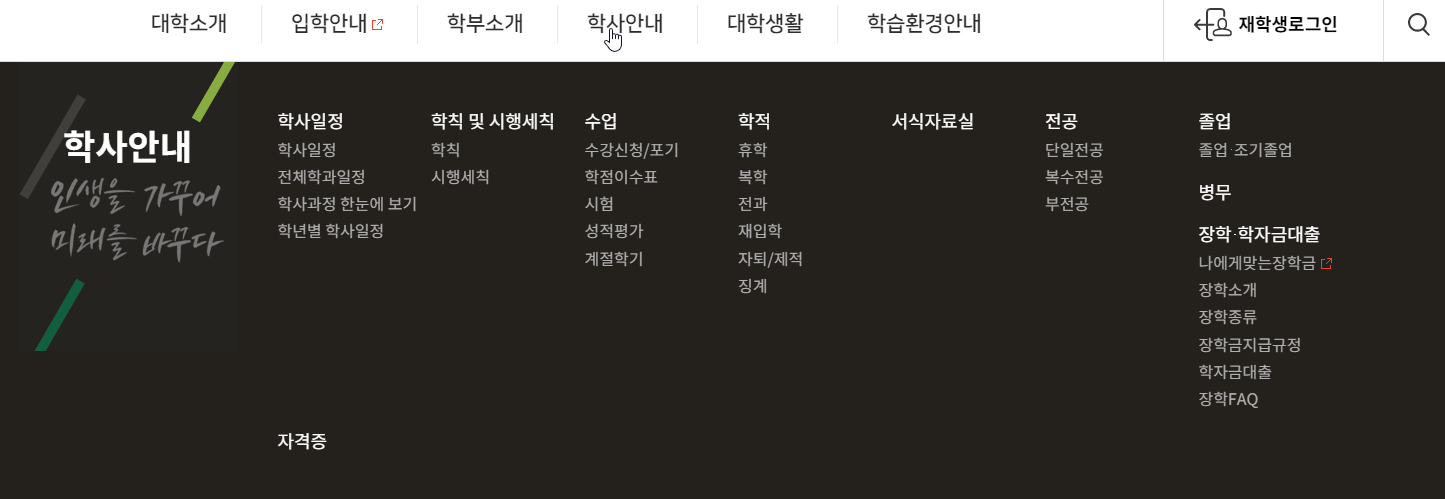 건양사이버대학교 홈페이지 학사안내 메뉴에서는 학사일정, 학과일정, 학칙, 시행세칙, 수강신청, 수강포기(드랍), 시험, 성적평가, 휴학, 복학, 재입학, 전과, 자퇴/제적, 징계, 전공, 졸업, 조기졸업, 장학금, 학자금대출에 대해서 살펴볼 수 있어요.