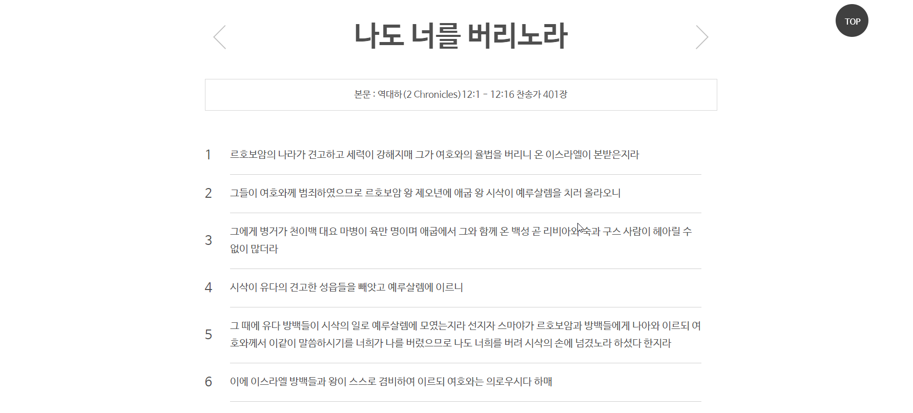 나도 너를 버리노라 본문:역대하(2 Chronicles) 12:1 - 12:16 찬송가 401장입니다.