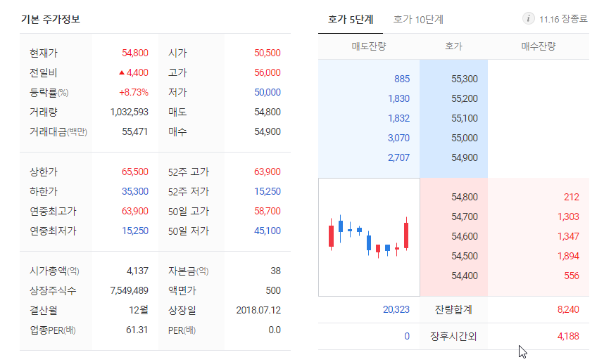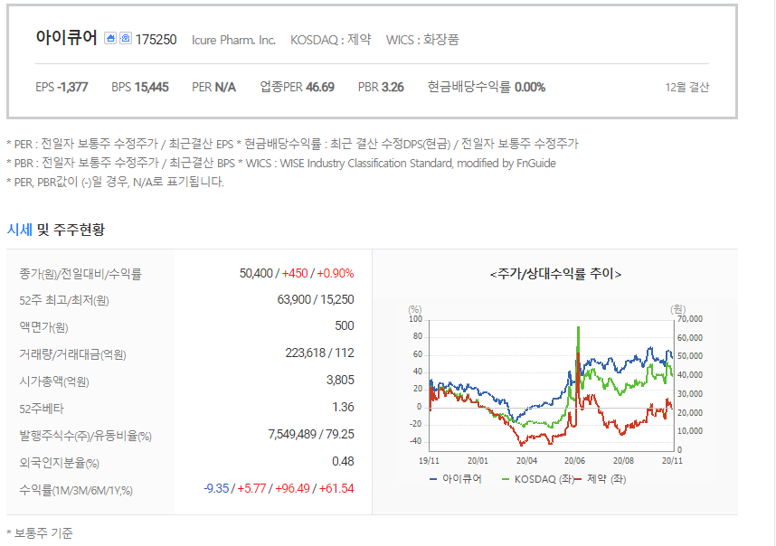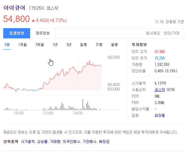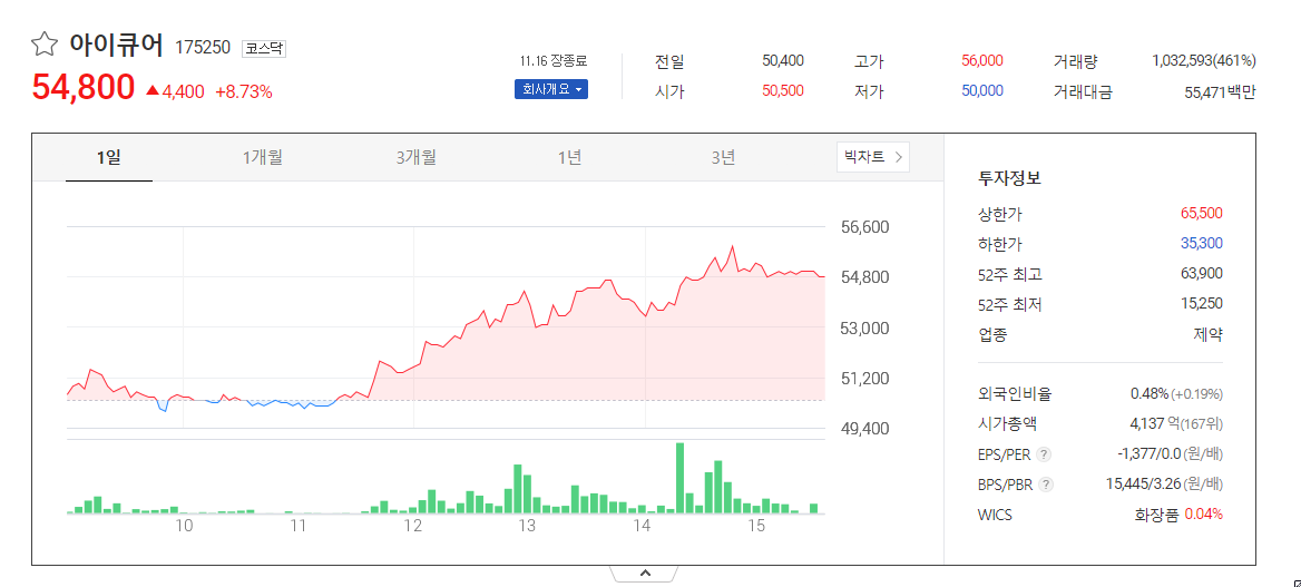 코로나19 백신 관련해서 아이큐어 기업이 핫한데요. 아이큐어 주가 살펴볼게요. 2020년 11월 16일 종가 기준으로 주가는 54,800원인데요. 아이큐어는 코스닥 상장 기업입니다. 52주 고가는 63,900원이었고요. 52주 저가는 15,250원입니다. 화장품 업종의 기업이고 PBR은 3.26배입니다.
