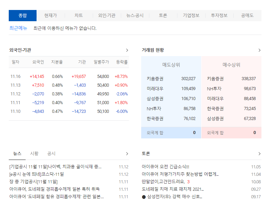 아이큐어 기업의 외국인 및 기관 매매동향도 다음 금융정보에서 확인하실 수 있습니다.