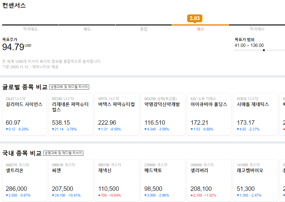 미국 모더나의 컨센서스입니다. 적극매도, 매도, 중립, 매수, 적극매수로 분류되어 있는데요. 3.93 매수입니다. 목표주가는 94.89 USD입니다. 그외에 길리어드 사이언스, 리제네론 파마슈티컬스, 버텍스 파마슈티컬, 약명강덕신약개발, 아이큐비아 홀딩스, 셀트리온, 씨젠, 제넥신, 메드팩토, 셀리버리, 레고켐바이오 종목과 비교해보시기 바랍니다.