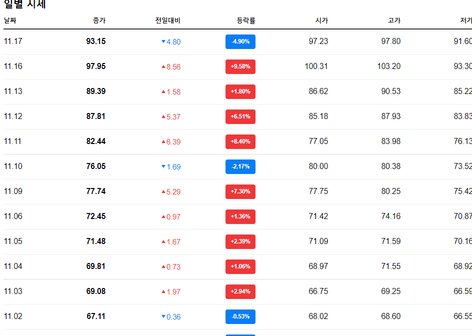 모더나 주가의 일별 시세도 확인해보시기 바랍니다. 종가 ,전일대비, 등락률, 시가, 고가, 저가가 나와있습니다.
