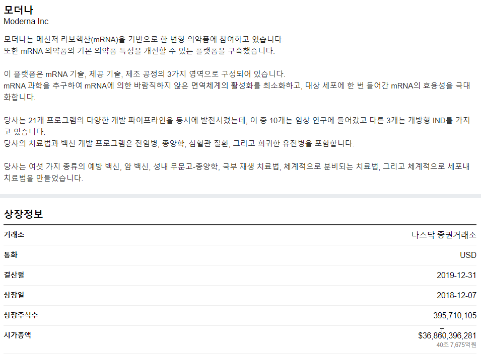 모더나 기업에 대한 설명도 볼 수 있는데요. 모더나는 메신저 리보핵산(mRNA) 기반으로 의약품을 연구하는 기업인가봐요. 예방 백신, 암 백신, 성내 무문고-종양학, 국부 재생 치료법, 체계적으로 분비되는 치료법 등을 만들었다고 합니다. 결산월, 상장일, 상장주식수, 시가총액 참고바랍니다.
