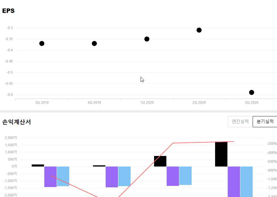 모더나의 EPS도 분기별로 확인할 수 있습니다. 손익계산서를 통해서 연간실적이나 분기실적도 확인할 수 있고요.