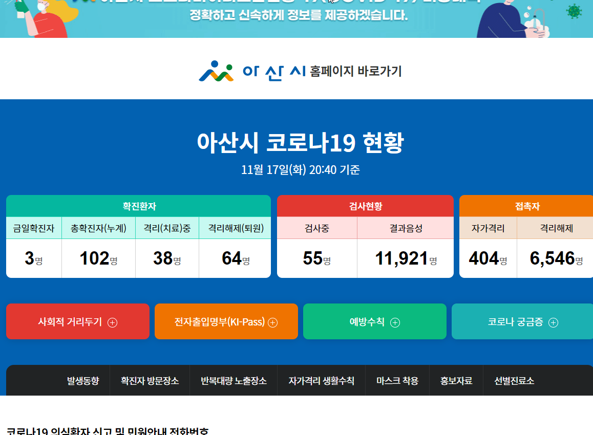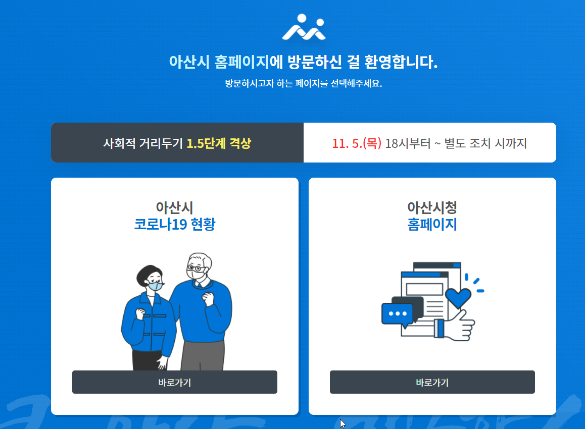 11월 5일 목요일부터 사회적 거리두기가 1.5단계로 격상되는데요. 참고하시고요. 아산시 코로나19 현황도 아산시청 홈페이지 통해서 확인해보시기 바랍니다.