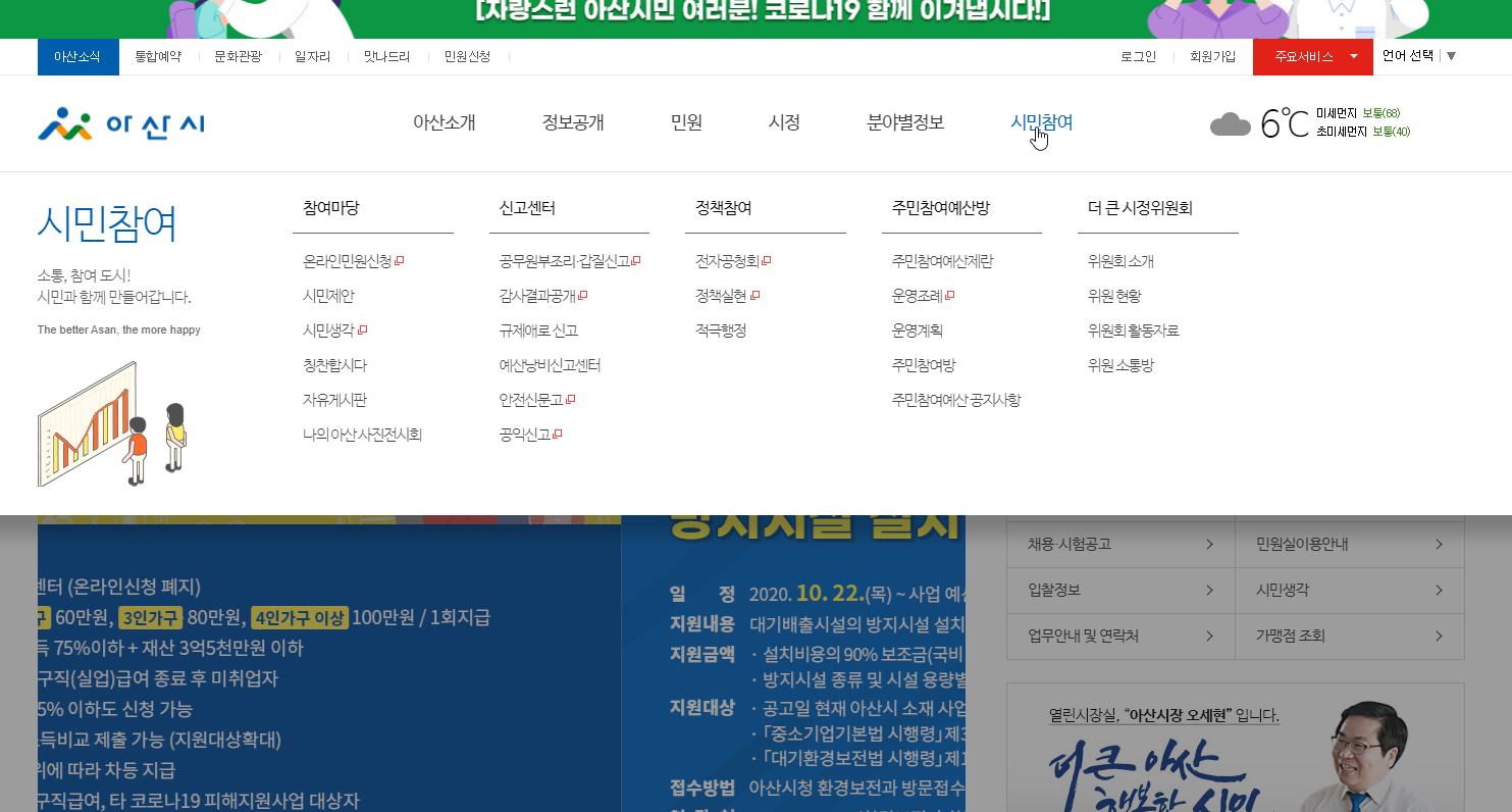 아산시청 홈페이지에서는 온라인 민원신청을 할 수 있고요. 공무원부조리 갑질신고, 감사결과 공개, 규제애로 신고, 안전신문고, 공익신고, 전자공청회, 정책실현, 주민참여예산제, 주민참여방 참고바랍니다.