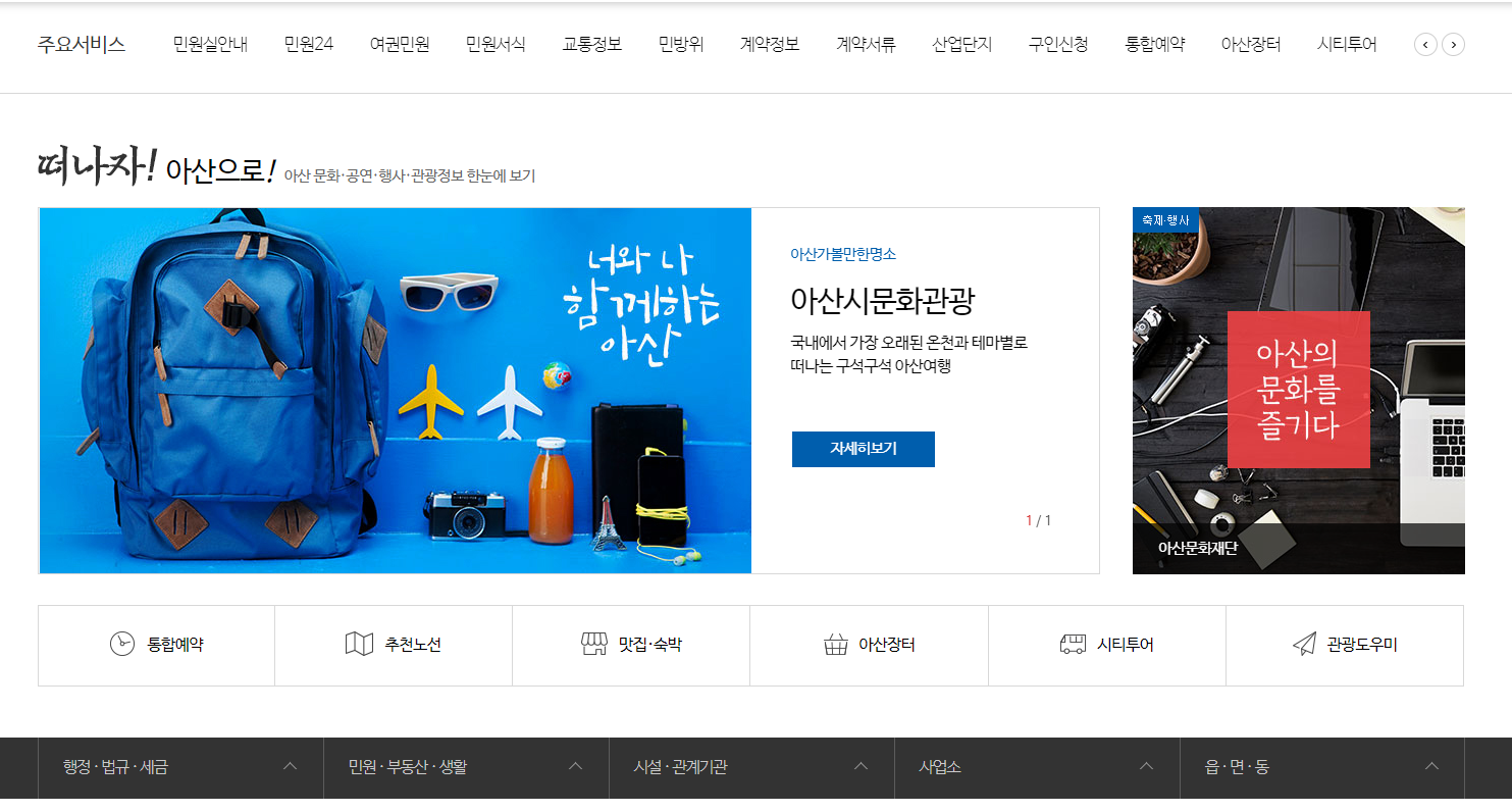 아산시문화관광 홈페이지가 있는데요. 통합예약, 추천노선, 맛집 숙박, 아산장터, 시티투어, 관광도우미 서비스 이용해보시기 바랍니다.