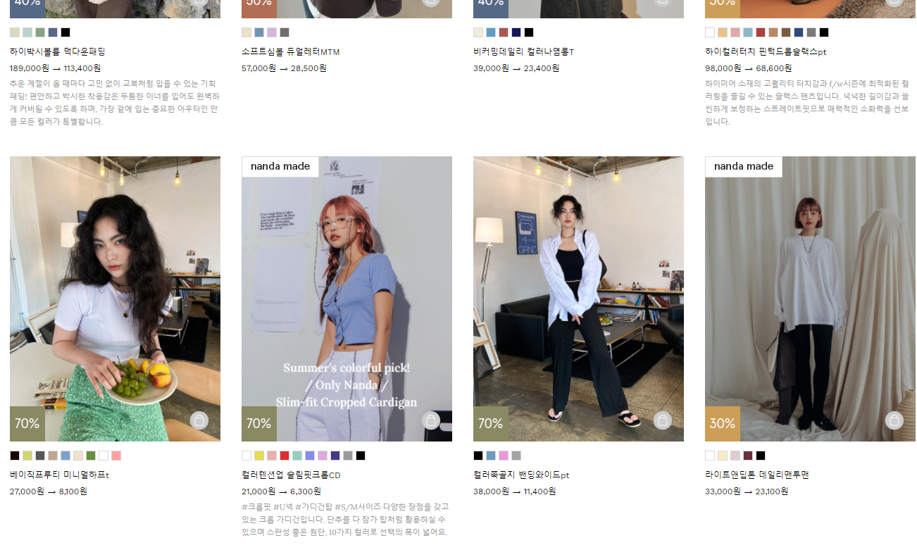 하이박시볼룸 맥다운패딩, 베이직프루티 미니멀 하프, 컬러텐션업 슬림핏크롭, 컬러골지 밴딩와이드, 데일리맨투맨 등 옷들 살펴보세요.