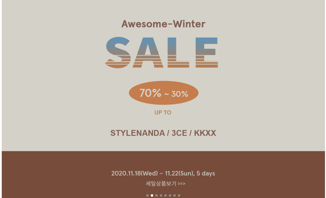 스타일난다 세일은 2020년 11월 18일부터 22일까지 총 5일간 진행되는데요. 최대 70%까지 할인한다고 합니다.