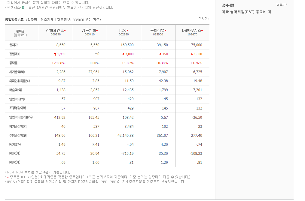 삼화페인트 주가 관련하여 동일업종비교도 네이버 증권 홈페이지에서 볼 수 있는데요. 쌍용양회, KCC, 동화기업, LG하우시스의 현재가 ,등락율, 시가총액, 외국인취득률, 매출액, 영업이익 등의 정보 확인할 수 있어요.