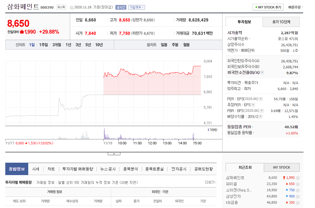 삼화페인트 주가입니다. 2020년 11월 18일 장마감 기준으로 8,650원입니다. 전일대비 29.88%가 올랐고요. 고가, 저가, 시가 확인 바랍니다. 시가총액, 시가총액순위, 상장주식수, 주가, 액면가, 외국인소진율, EPR, EPS, PBR, BPS 참고바랍니다.