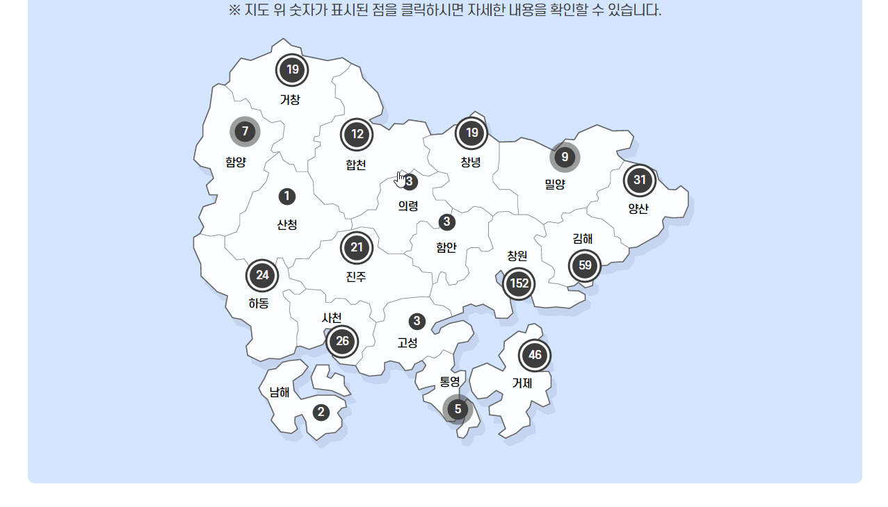 경남 코로나 확진자 관련해서 분포도도 볼 수 있어요. 창원, 진주, 통영, 사천, 김해, 밀양, 거제, 양산, 의령, 함안, 창년, 고성, 남해, 하동, 산청, 함양, 거창, 합천 지역별로 확진자 현황을 볼 수 있어요.