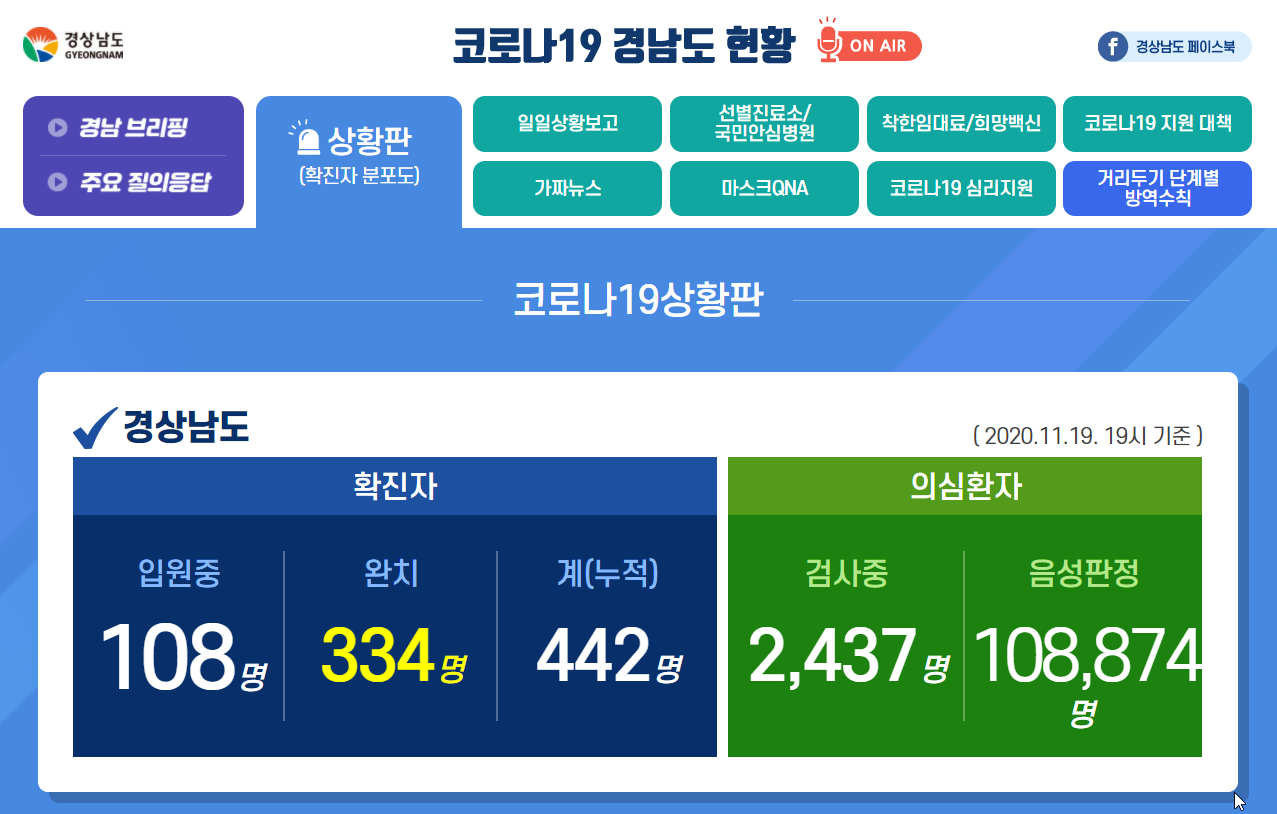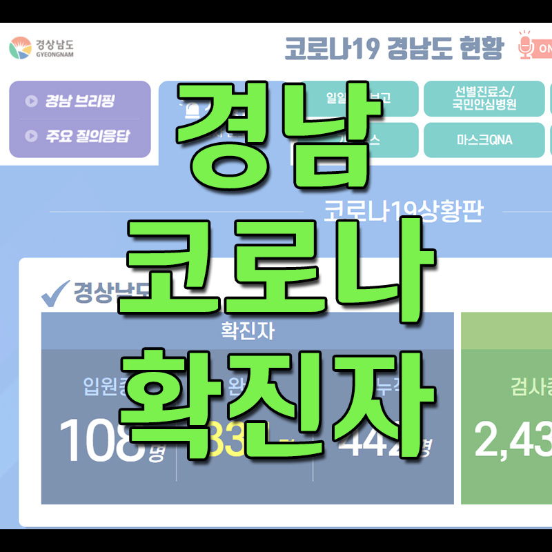 경상남도 홈페이지에서 경남 코로나 확진자 현황 및 상황판을 볼 수 있는데요. 경남 브리핑, 질의응답, 일일상황보고, 선별진료소/국민안심병원, 마스크 QNA, 착한임대료/희망백신, 코로나19 심리지원, 코로나19 지원 대책, 거리두기 단계별 방역수칙 참고하세요.