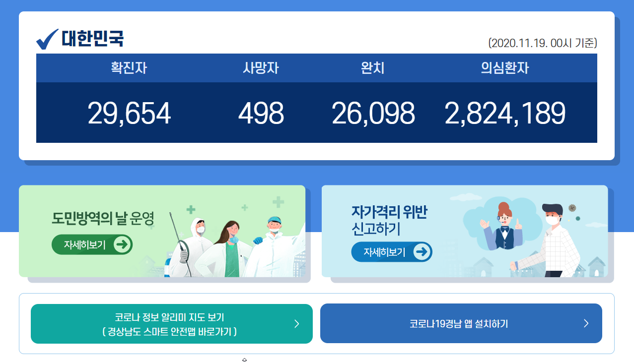 이렇게 경남 코로나 확진자 현황을 볼 수 있는데요. 확진자 수, 사망자 수, 의심환자 수, 완치자 수를 볼 수 있어요. 도민방역의 날 운영, 자가격리 위반 신고하기에 대해서도 살펴보시기 바랍니다. 코로나 정보 알리미 지도도 있네요.