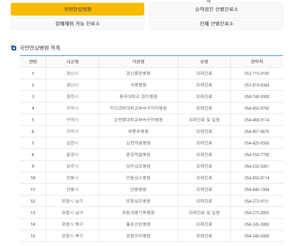 국민안심병원, 승차검진 선별진료소, 검체채취 가능 진료소, 전체 선별진료소 기관, 연락처도 볼 수 있어요. 국민안심병원 목록도 확인해보시기 바랍니다. 경산중앙병원, 경산시 세명벙원, 동국대학교 경주병원, 차의과학대학교부속구미차병원, 순천향대학교부속구미병원, 구미시 바른유병원, 김천시 김천제일병원, 문경시 문경제일병원, 상주성모병원, 안동성소병원, 안동병원, 포항성모병원, 포항세명기독병원, 좋은선린병원, 포항시 북구 포항우리병원이 국민안심병원입니다.