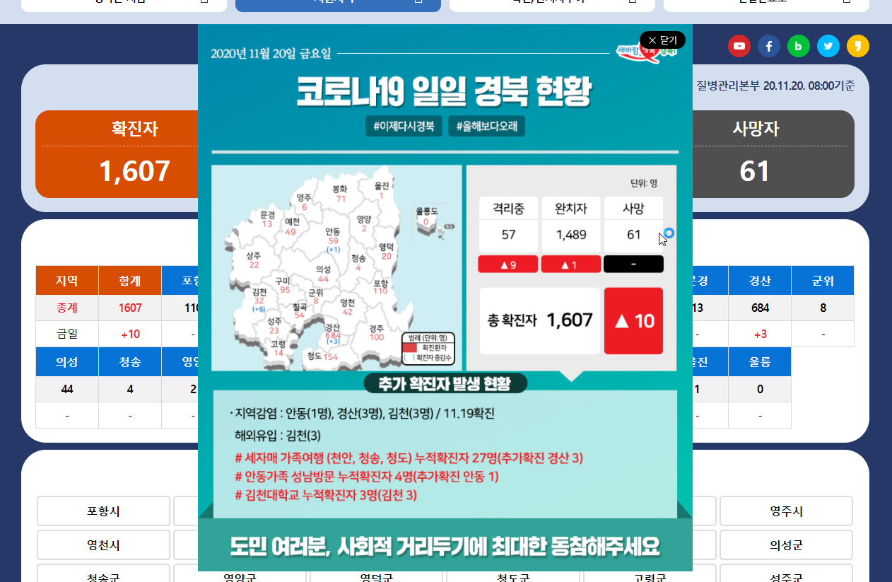 경상북도 홈페이지 코로나19 현황 사이트를 통해서 경북 코로나 확진자 현황을 볼 수 있습니다. 일일 경북 현황이 팝업창으로 뜨는데요. 격리중인 환자 수, 완치자 환자 수, 사망자 수가 나와요. 추가 확진자 발샌 현황도 나와있는데요. 11월 19일 기준으로 안동, 경산, 김천에서 발생하였네요.