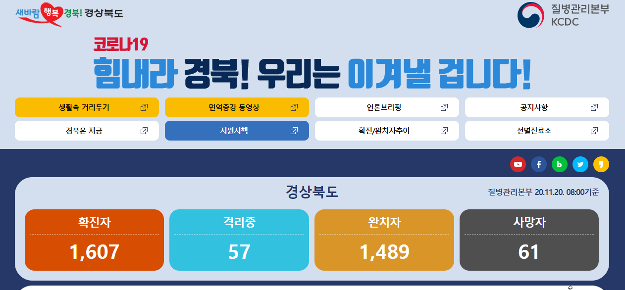 경북 코로나 확진자 현황 살펴보겠습니다. 경상북도 홈페이지에서는 생활속 거리두기, 면역증강 동영상을 볼 수 있어요. 그리고 언론브리핑과 공지사항을 확인할 수 있습니다. 지원시책이나 확진자 및 완치자 추이도 살펴보시기 바랍니다.