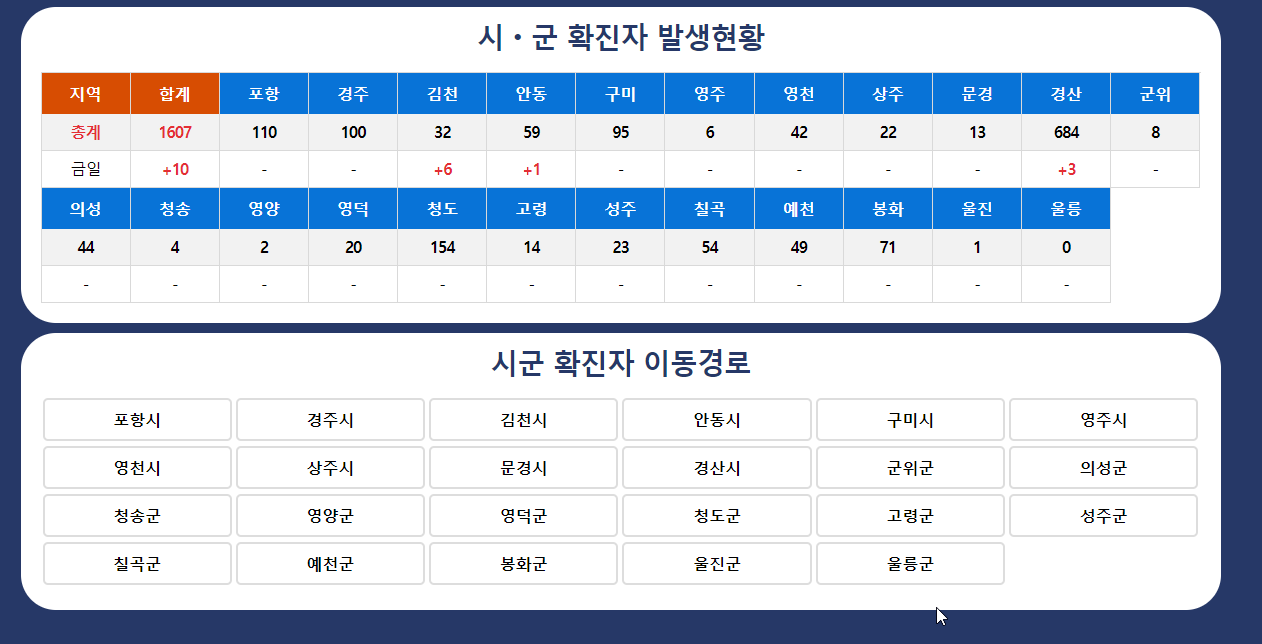 경북 코로나 확진자 현황으로 시군 확진자 발생 현황이나 시군 확진자 이동경로를 볼 수 있는데요. 경상북도 포항시, 경주시, 김천시, 문경시, 상주시, 영천시, 경산시, 안동시, 구미시, 군위군, 의성군, 영주시, 청송군, 영양군, 영덕군, 청도군, 고령군, 칠곡군, 예천군, 봉화군, 울진군, 울릉군의 확진자 동선을 볼 수 있어요.