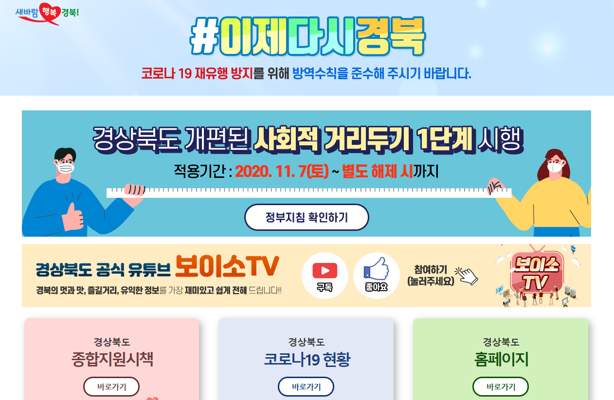 코로나19 바이러스 재유행 방지를 위해 방역수칙을 준수하는 것 잊지 마시고요. 한번의 방심이 엄청난 바이러스 확산을 불러일으킬 수 있으니까요. 경상북도는 현재 개편된 사회적 거리두기 1단계를 시행하고 있습니다. 경상북도 홈페이지로 이동하셔서 확인해보시기 바랍니다.