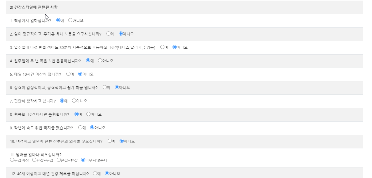 건강스타일에 관련된 사항도 답변을 하면 되는데요. 책상에서 일하는지, 육체적 노동을하는지, 행복한지, 불행한지, 운동을 하는지, 담배를 피우는지 등에 답변하시면 됩니다. 기대수명 계산기라니 기대가 되네요. 저의 수명은 어떻게 될까요?