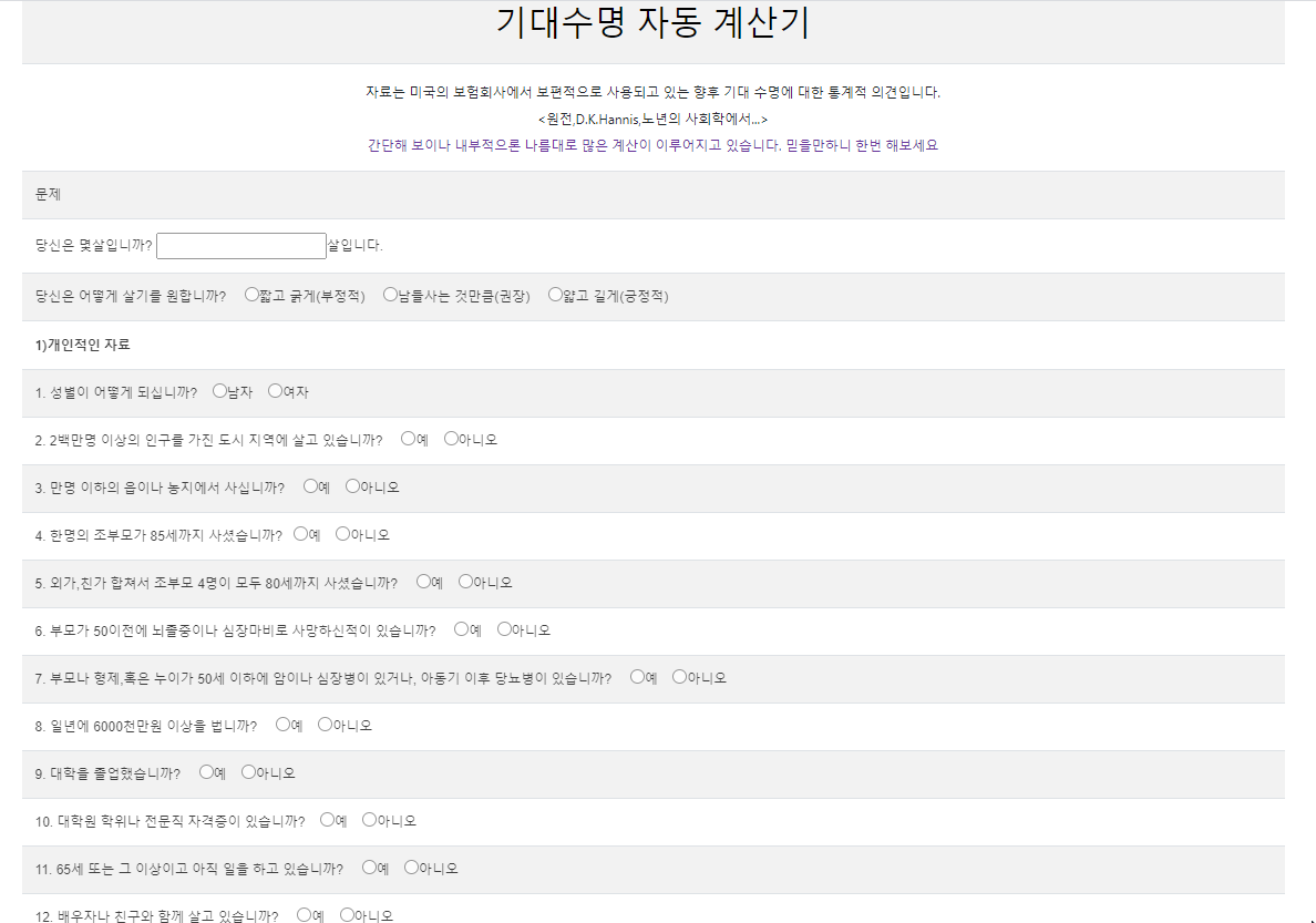 오늘은 재밌는 걸 가져왔습니다. 기대수명 자동 계산기인데요. 미국의 보험회사에서 사용하는 통계적 의견에 따른 기대수명 계산기예요. D.K.Hannis의 노년의 사회학과 관련되어 있나봅니다.