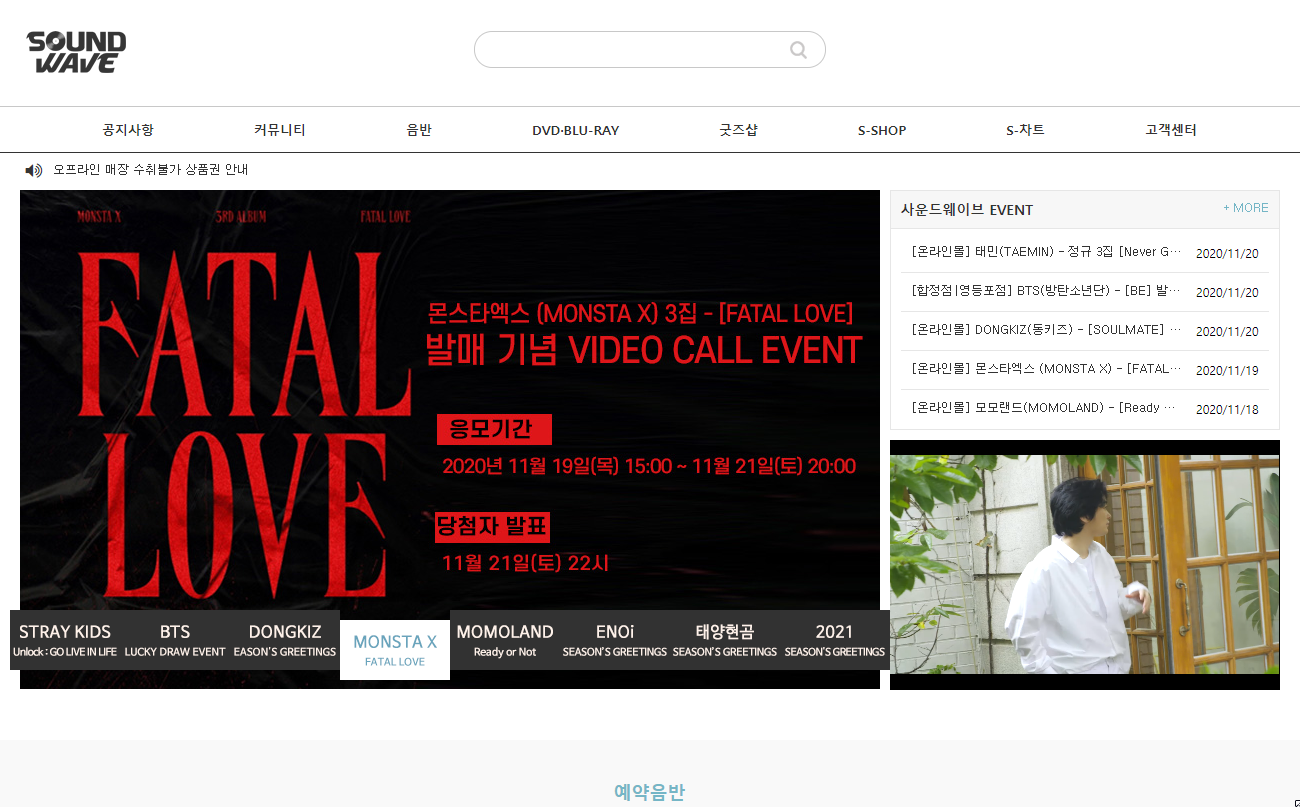사운드웨이브에서는 케이팝 정보를 확인할 수 있는데요. 스트레이 키즈 Stray kids, 방탄소년단 BTS, 동키즈, 몬스타엑스, 모모랜드, 태양현곰 등의 팬사인회 및 라이브 공연 등 이벤트 정보도 볼 수 있어요. 사운드웨이브 합정점 및 영등포점에서는 방탄소년단 BE 발매 기념 럭키 드로우 이벤트를 진행하네요.