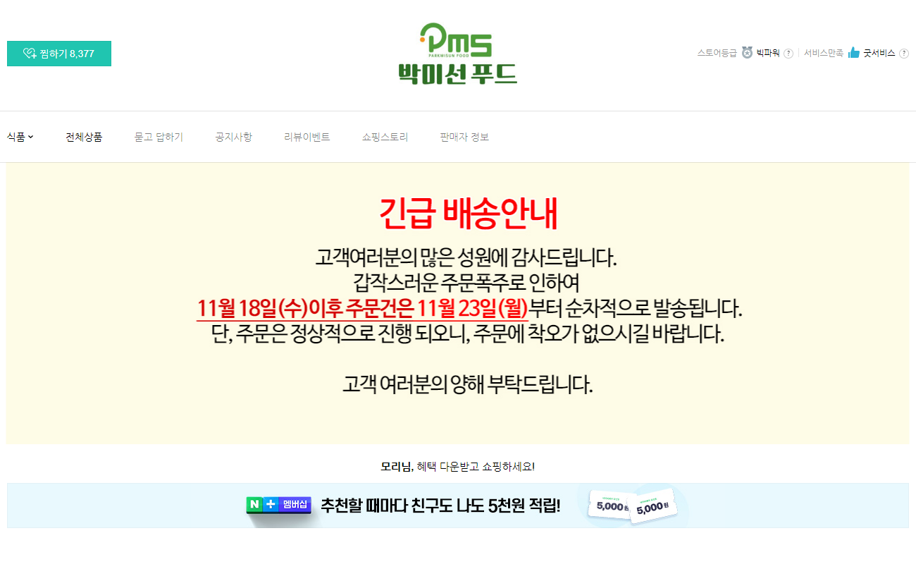 박미선 푸드 쇼핑몰에서 볼 수 있는 쫀득쫀득한 떡!! 주문폭주로 11월 18일 이후 주문 건은 11월 23일부터 순차배송된다고 하니 참고바라요.