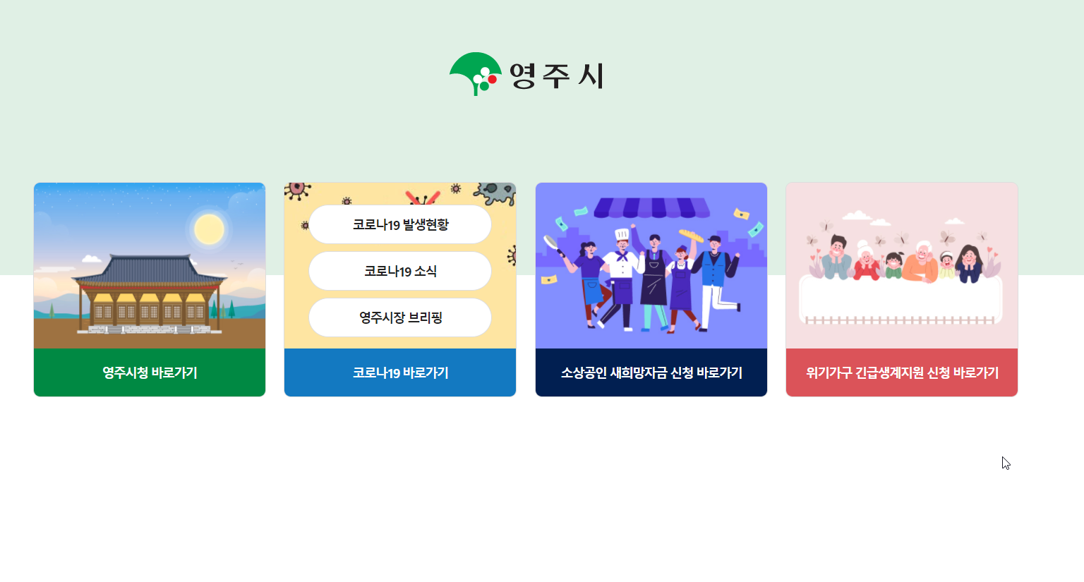 코로나19 발생현황, 코로나19 소식, 영주시장 브리핑 볼 수 있고요. 소상공인 새희망자금 신청 및 위기가구 긴급생계지원 신청도 영주시청 홈페이지에서 할 수 있습니다.