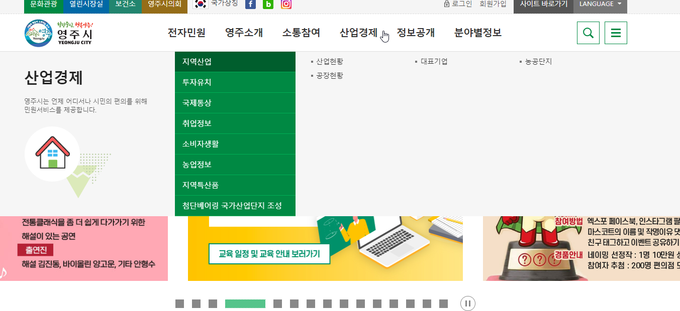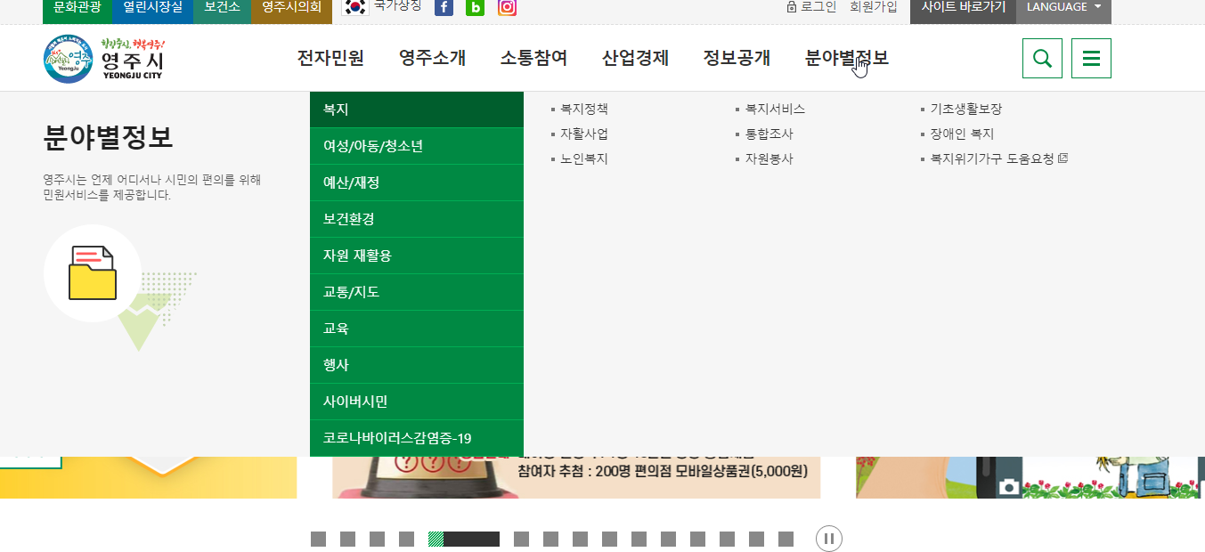 영주시청 홈페이지에서 복지, 여성/아동/청소년, 예산/재정, 보건환경, 자원 재활용, 교통/지도, 교육, 행사 등 분야별 정보도 체크해보세요~