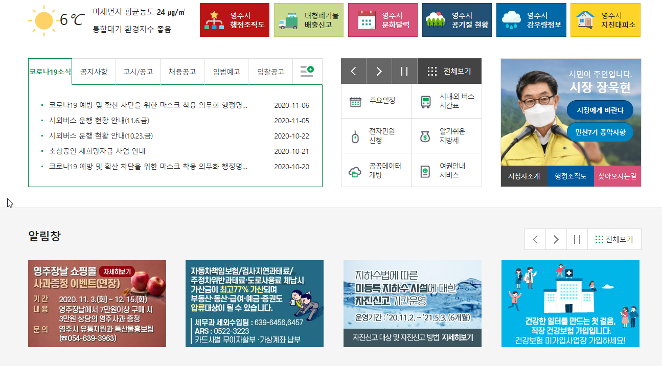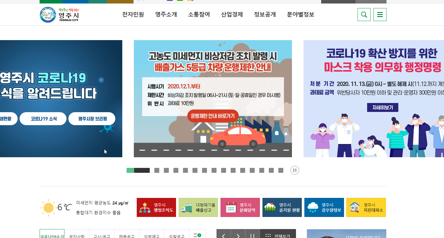 영주시청 홈페이지에서 코로나19 소식 확인해보시고요. 고농도 미세먼지 비상저김 조치 발령 시 배출가스 5등급 차량 운행 제한 안내, 코로나19 확산 방지를 위한 마스크 착용 의무화 행정명령도 확인해보시는 것이 좋을 것 같습니다. 그 외에 영주시 행정조직도, 대형폐기물 배출신고, 영주시 문화달력, 공기질 현황, 영주시 강우량 정보, 지진대피소도 확인할 수 있어요.