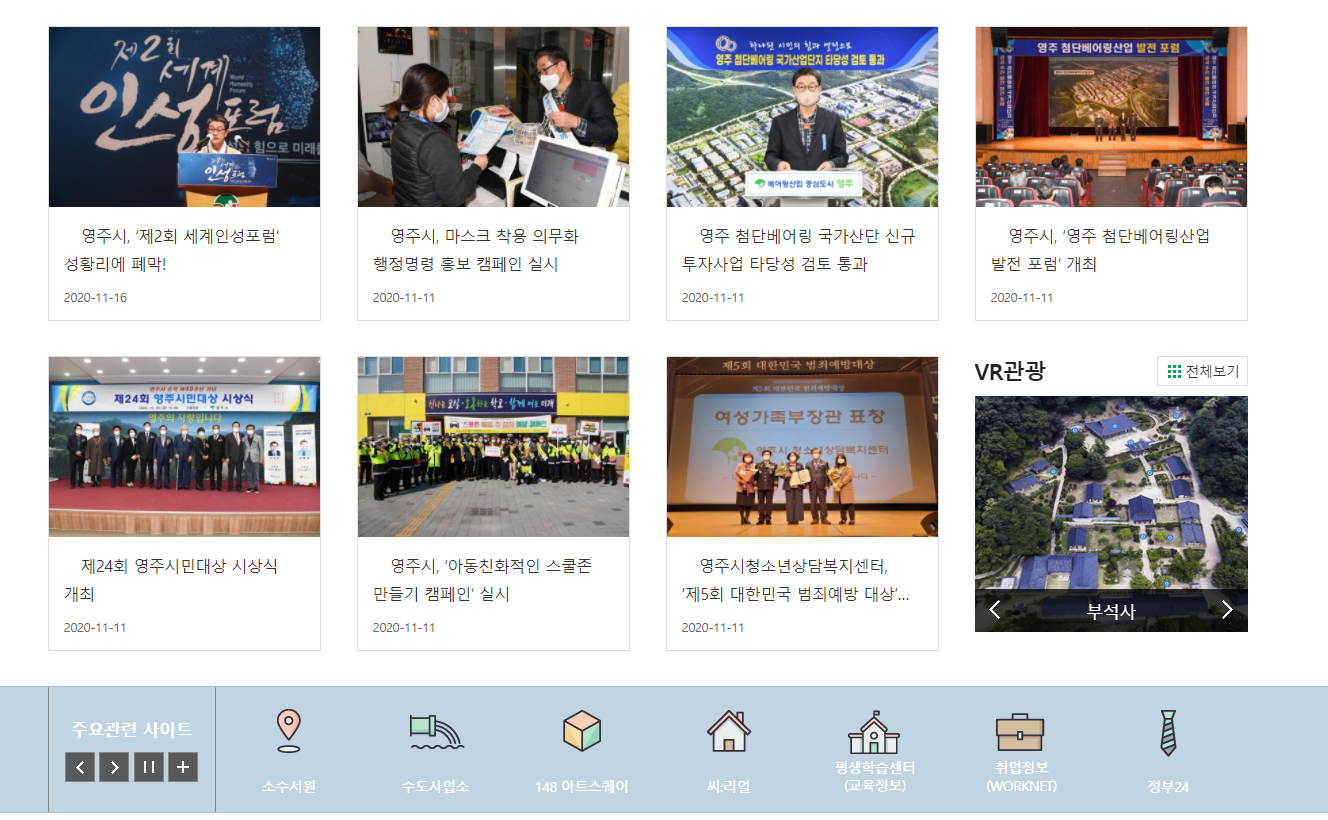 영주시 홈피에서 이렇게 지역 소식도 볼 수 있네요. 제2회 세계인성포럼, 첨단베어링 국가산단, 영주시민대상 시상식 등 소식 확인해보세요.