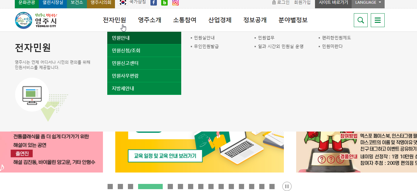 영주시청 홈페이지에서는 민원신청 및 조회, 지방세 안내, 민원사무편람, 무인민원발급 가능하고요.
