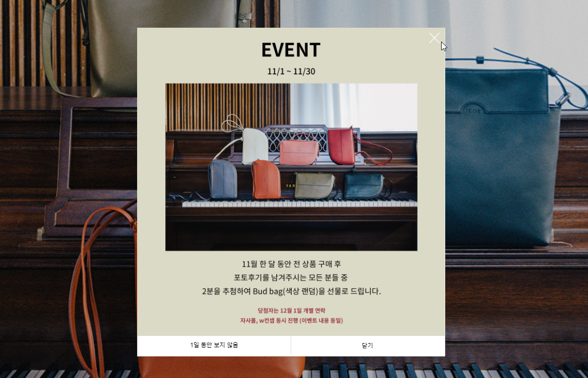 현재 11월 이벤트로 한달 동안 전 상품 구매 후 포토후기를 남겨주시는 모든 분들 중 2분을 추첨하여 Bud bag를 선물로 준다고 하네요.
