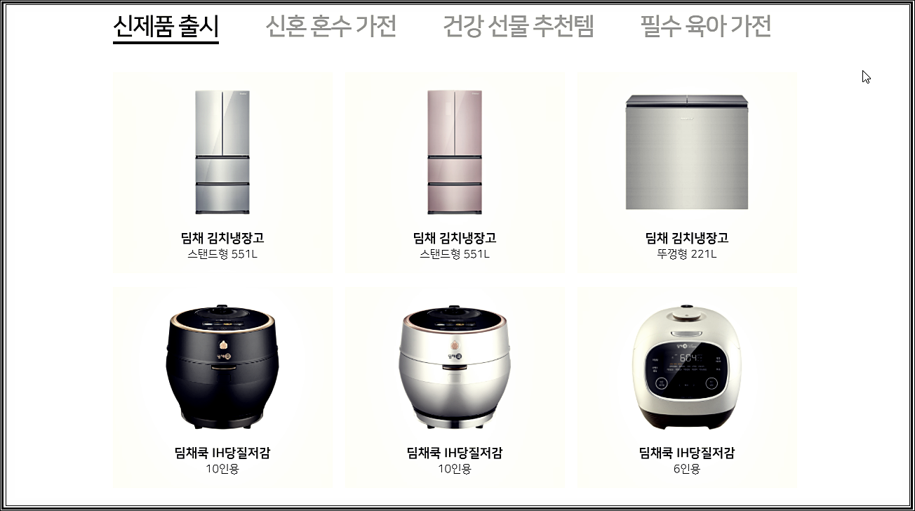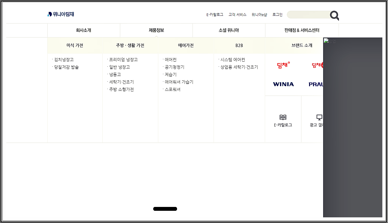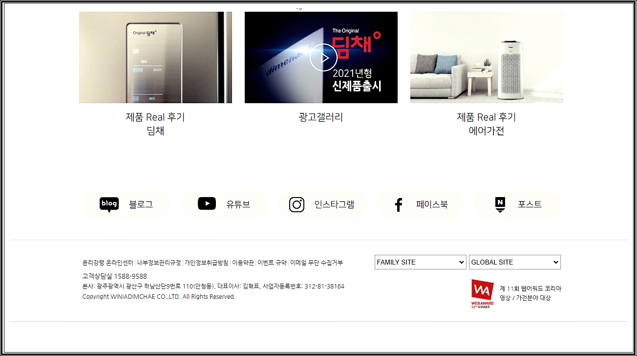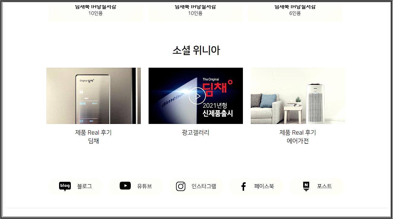 이렇게 위니아 딤채 홈페이지에 방문하시게 되면 제품 리얼 후기, 광고갤러리, 에어가전을 볼 수 있어요.